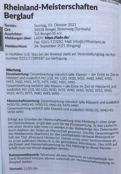Am 03.10.2021 finden in Bengel die Rheinland Meisterschaften Berglauf statt.